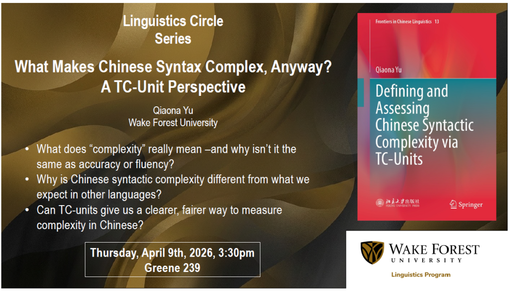 You are warmly invited to the Linguistics Circle Series presentation, What Makes Chinese Syntax Complex, Anyway? A TC-Unit Perspective, presented by Qiaona Yu.